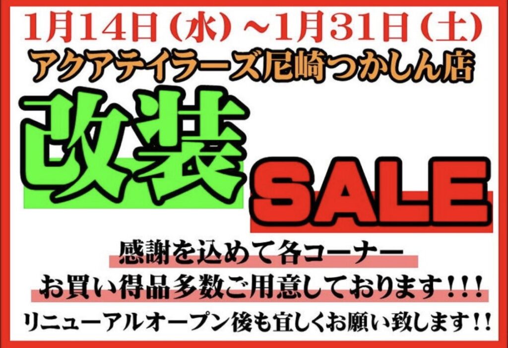 アクアテイラーズ尼崎つかしん店は2月1日より改装のため休業とさせて頂きます。